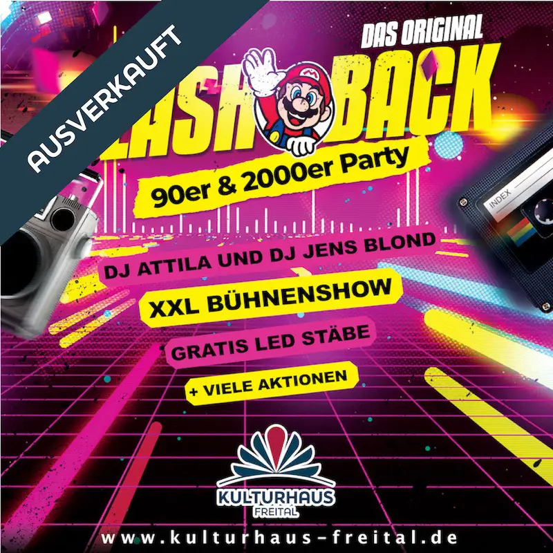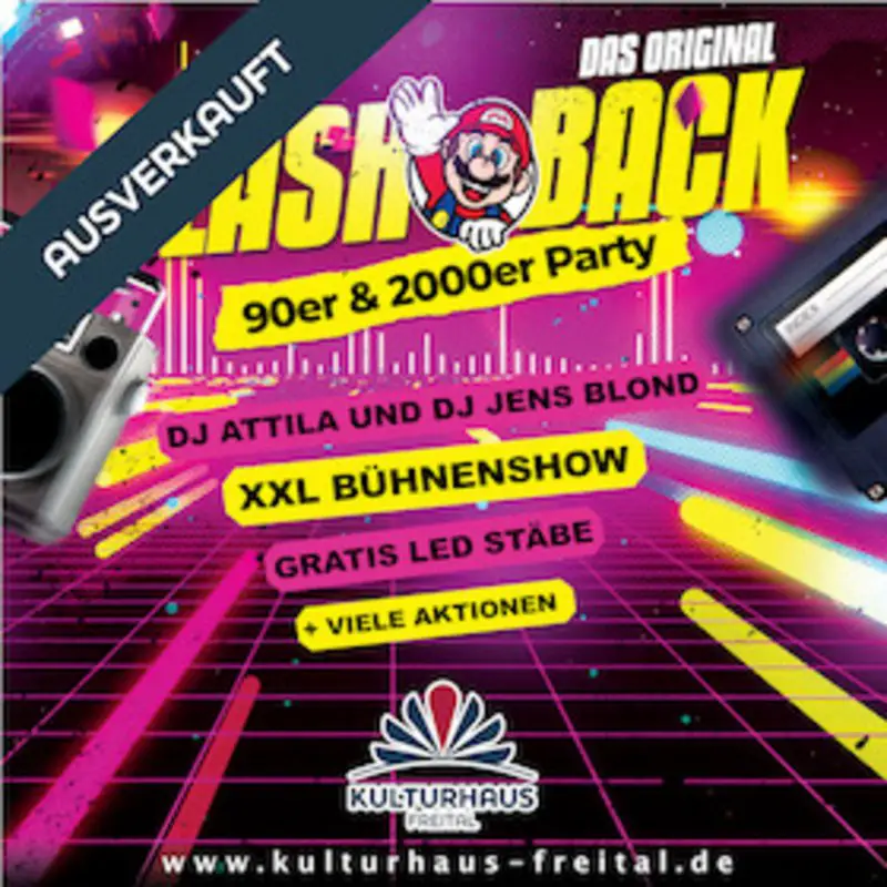 Bitte habe Verständnis dafür, dass wir als Dresden Nightlife für die Veranstaltung Flashback Party · mit DJ Attila (08.11.2025), Kulturhaus Freital keine Gewähr auf Richtigkeit und Vollständigkeit geben können. Diese Informationen werden von Tickets, Eintrittskarten und Karten Online Vorverkauf: www.reservix.de. regelmäßig importiert und es kann sein, dass diese Informationen sich kurzfristig geändert haben.